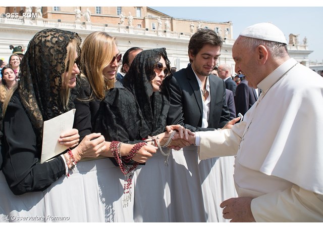 (梵蒂冈电台讯)教宗方济各4月15日上午在圣伯多禄广场主持周三公开接见活动。来自世界各地的大约5万名朝圣人士参加了教宗的接见活动。教宗继续以家庭为主题进行要理讲授。他强调天主造了男人和女人,赋予他们互补的特性和同等的尊严。