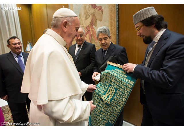 (梵蒂冈电台讯)教宗方济各元月20日上午在梵蒂冈保禄六世大厅书房接见了穆斯林代表团,他们当场邀请教宗访问罗马清真寺。这个代表团的成员包括意大利伊斯兰团体(COREIS)的伊玛目帕拉维奇尼(Yahya Pallavicini),以及意大利伊斯兰文化中心主任勒杜安(Abdellah Redouane)。