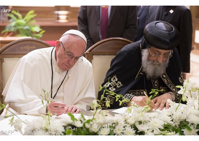 教宗对他在埃及访问时得到的“盛情款待”,也对在基督奥体中加固了圣洗上的合一表示“特别的感谢”。教宗和宗主教4月28日在开罗签署的联合声明承诺要“全心全意诚挚地寻求不再对我们教会中任何想要加入对方教会的信友,重复施行圣洗圣事”。教宗引述联合声明中的话说,我们之间的兄弟情谊“激发我们加强我们的共同努力,在圣神的引导下,坚持在多样性中寻求合一”。