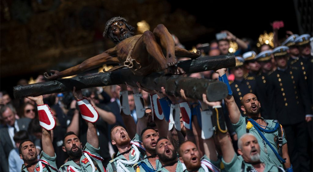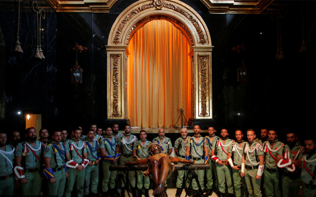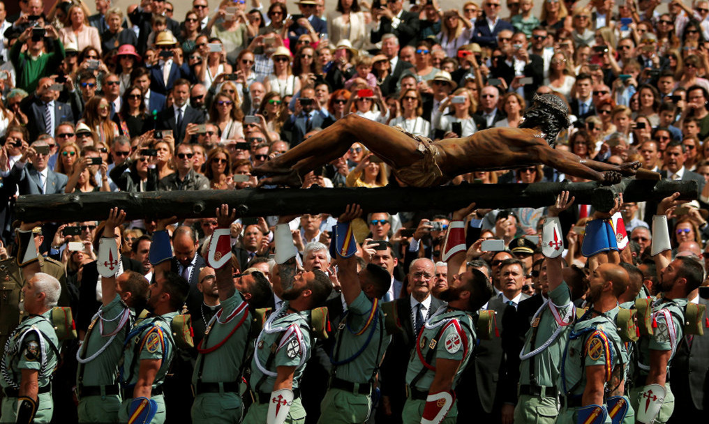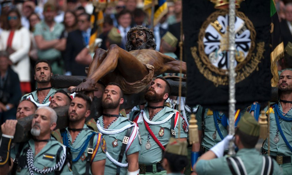 当地时间2017年4月13日,西班牙马拉加,西班牙士兵抬着耶稣雕像,庆祝圣周。