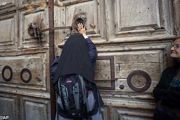 信徒在圣墓大殿门前祈祷 - AP