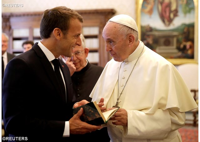 在“亲切的会谈”中,教宗与马克龙总统谈及“环保”、“移民”,以及为“预防和解决冲突”所需的多边承诺,特别在裁军方面的努力。此外,教宗与法国总统“就某些冲突局势,特别是在中东和非洲的情况,交换了意见”。最後他们“一同反思欧洲项目的前景”。